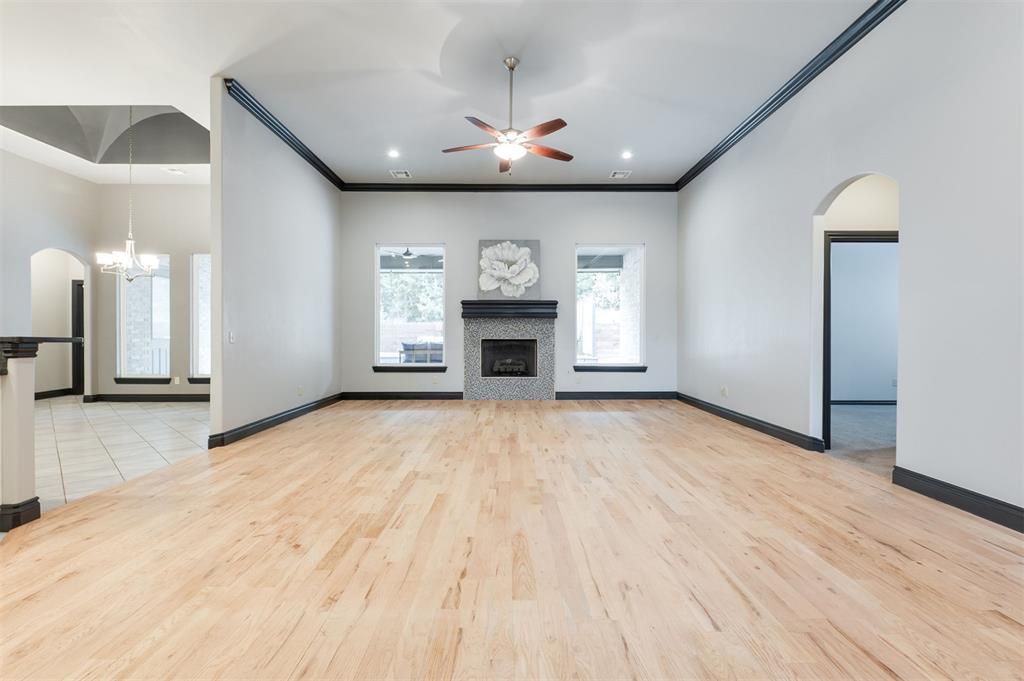 **NEW PRICE!**This stunning home is located in Oakdale Valley, a highly sought after gated community directly across from highly acclaimed Oakdale Schools. It combines space, charm, and functionality in a truly unbeatable location. From the moment you arrive, this home makes a statement with its brick and stone exterior, inviting front porch, and grand double-door entry. Step inside to a beautiful and welcoming foyer that sets the tone for the rest of the home, opening seamlessly into a spacious open-concept living area featuring white oak flooring and a cozy fireplace - perfect for everyday living and entertaining.Just off the foyer, you'll find a private study with custom built-ins, ideal for working from home, featuring the same beautiful white oak floors and ample natural light. The bright, oversized kitchen is a true centerpiece, offering two large islands, ample cabinetry and countertop space, and a dedicated dining area that flows effortlessly into the living space. Off the kitchen, enjoy movie nights or entertaining in the spacious media room with a wet bar.The primary suite is a retreat fit for a king and queen, complete with a spa-like en suite bathroom featuring a soaking tub, dual vanities, a large walk-in shower, and an expansive walk-in closet. On the opposite side of the home, the secondary bedrooms offer privacy and comfort. Two with their own full bathrooms, and one showcasing vaulted ceilings. Step outside to a backyard designed for entertaining, featuring a large covered patio and deck, and peaceful views of the wooded greenbelt behind the home, offering privacy and serenity.Oakdale Valley residents enjoy neighborhood amenities including walking paths, a pond, and a community pool and clubhouse with a gym. Many families in the neighborhood walk their kids to school. Homes like this don't come around often!
