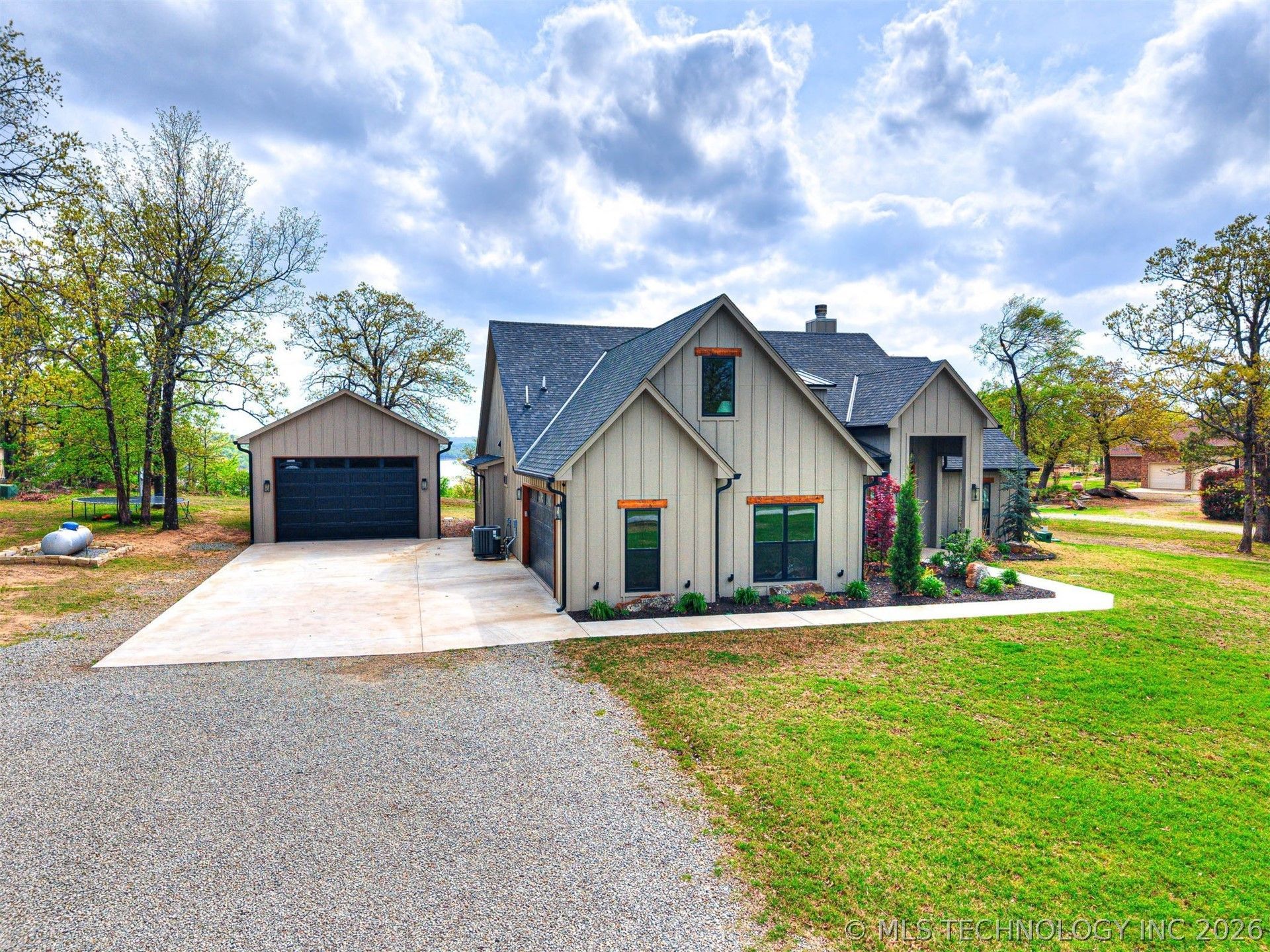 Experience luxury lake living in this immaculate, fully furnished 2024 custom-built home offering breathtaking water views, thoughtful design, and true turnkey convenience. This home is perfectly positioned to capture peaceful lake views and unforgettable Oklahoma sunsets. The main level features three spacious bedrooms, including a stunning primary suite with lake views, a spa-like ensuite bath complete with dual vanities, quartz countertops, a jacuzzi tub, and a large walk-in closet, plus convenient access to the laundry room with sink, and storage. At the heart of the home is a chef's kitchen featuring GE Caf appliances, quartz countertops, abundant cabinetry, and a large pantry, all opening into the dining and living areas. The living room showcases soaring ceilings and a beautiful natural stone, wood-burning fireplace, creating an inviting space ideal for entertaining. Upstairs offers a private 4th bedroom with an ensuite bathroom, perfect for guests or additional privacy. Additional interior features include: Low-maintenance, high-end flooring and tile Custom lighting and luxury finishes Functional mudroom with built-in storage and hooks Spray foam insulation for energy efficiency Tankless hot water heater High-efficiency windows The exterior is equally impressive, situated on a large, beautifully landscaped lot with irrigation in flower beds and excellent curb appeal. Enjoy lake views from the covered back patio, ideal for outdoor dining, relaxing, or entertaining. Storage and versatility are unmatched with an attached oversized two-car garage plus a 21x30 detached shop/garage featuring overhead electric door-perfect for boat storage, RV, lake toys, or workshop space. Residents also have the option to purchase a boat slip within the neighborhood, adding even more value and convenience for lake enjoyment. Located in a quiet, peaceful setting just minutes from town, this property offers the perfect balance of privacy, luxury, and accessibility.
