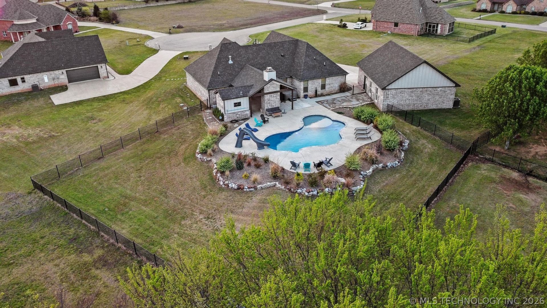 Beautiful single-story home on .6 acre in a small, well-maintained gated HOA community featuring a private catch-and-release fishing lake stocked with largemouth bass! Approx. 2,000 SF offering 3 bedrooms, 3 bathrooms, and an open-concept layout with LVP and tile flooring throughout. Spacious living area with corner brick gas fireplace and floor-to-ceiling shiplap accent. Kitchen includes solid wood cabinets, designer countertops, and a no-touch faucet. Large pantry and oversized utility room with walk-through access to the expansive primary closet. Additional highlights include shiplap feature walls in the dining and office, plus an extra-large driveway leading to a 30x40 air-conditioned, fully finished shop. Backyard is an entertainer's dream with fenced yard, upgraded landscaping, saltwater pool, and expansive outdoor living space. Covered back porch features a fireplace, hot tub, and convenient bathroom access. A rare find combining modern finishes, functional design, and resort-style outdoor living!